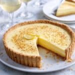 A classic custard tart featuring a buttery lemon-infused shortcrust pastry filled with a smooth vanilla and nutmeg custard, baked to a delicate set with a slight wobble and finished with a sprinkle of fresh nutmeg.