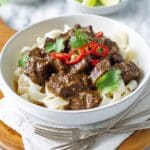 - Step 7: Divide the noodles between two bowls, spoon the beef stew over the top, and garnish with the remaining sliced chilli and coriander leaves. Serve with lime wedges for squeezing over.