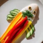- Add facial features and fins: Use black olive slices to form the fish’s eyes and cucumber slices for the mouth. Arrange remaining vegetable pieces creatively around the fish to create tail fins and side fins.