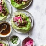 - Step 5: To serve, spoon the pork mixture into lettuce cups. Top each cup with pickled onions, radishes, avocado slices, green onions, fresh cilantro leaves, and sprinkle with sesame seeds. Serve with the prepared dipping sauce.