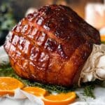 - Serve and Present: Remove cloves if used. Wrap the bone handle with baking paper and a ribbon for an elegant touch. Place the ham on a serving platter garnished with orange quarters and greenery. Slice thinly and serve warm or at room temperature, drizzling with pan juices or your preferred condiments.