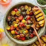 This Marinated Tomatoes recipe offers a vibrant and flavorful side dish featuring grape or cherry tomatoes marinated in a zesty blend of olive oil, vinegars, fresh herbs, garlic, and a touch of crushed red pepper. Perfect as a refreshing accompaniment or appetizer, the tomatoes absorb the bright and aromatic marinade, creating a delicious burst of summer freshness.