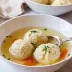 Classic homemade Matzo Ball Soup featuring light and fluffy matzo balls simmered in flavorful chicken broth, perfect for a comforting and traditional meal.