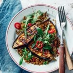 Keywords: miso aubergine, roasted aubergine, giant couscous, vegetarian dinner, Japanese-inspired recipes, miso glaze, healthy vegetarian meal