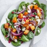 A vibrant and flavorful Moroccan-inspired salad featuring roasted sweet potatoes, parsnips, carrots, and red onions seasoned with fragrant ras-el-hanout, combined with fresh baby spinach, tart pomegranate seeds, creamy light feta, and a tangy balsamic vinegar dressing. Perfect as a wholesome side or light meal packed with color and texture.