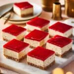 This no-bake peanut butter and jelly cheesecake squares recipe is a delightful twist on the classic sandwich. Combining a crunchy biscuit base, creamy peanut butter filling, and a vibrant raspberry jelly topping, it’s an easy dessert that’s perfect for any occasion.
