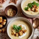 A comforting and flavorful parsnip and miso soup topped with crunchy sesame sourdough croutons, garnished with fresh coriander and creamy natural yogurt. This soup combines the sweetness of parsnips and potatoes with the umami depth of miso, and is perfect for a warming meal.