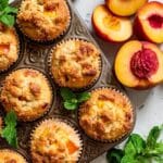 Keywords: Peach muffins, breakfast muffin recipe, cinnamon sugar muffins, Greek yogurt muffins, fruity muffins