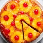 A classic Pineapple Upside Down Cake featuring caramelized pineapple rings and maraschino cherries layered beneath a moist, buttery vanilla cake. This easy-to-make dessert combines tropical flavors with a golden brown caramelized topping, perfect for any special occasion or family gathering.