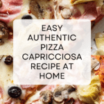 Authentic Pizza Capricciosa recipe featuring a classic Italian-style wood-fired dough or a quick no-yeast dough option, topped with a flavorful tomato sauce, fresh mozzarella, artichokes, mushrooms, ham, and kalamata olives. Perfectly baked to a crispy golden crust with melted cheese for a delicious homemade pizza experience.