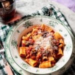 Keywords: porcini mushroom pasta, tomato rosemary pasta, slow simmered tomato sauce, rigatoni recipe, vegetarian pasta, mushroom pasta sauce