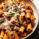 This Pot Roast Sunday Sauce with Rigatoni is a hearty, comforting meal perfect for a cozy weekend dinner. Tender beef chuck roast simmers slowly in a rich tomato and red wine sauce, then is tossed with rigatoni, cream, and parmesan for a satisfying finish.