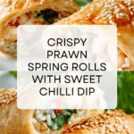 Crispy prawn spring roll wraps packed with fresh stir-fry vegetables, aromatic ginger, and coriander, wrapped in delicate filo pastry and baked to golden perfection. These vibrant and flavorful spring rolls make a perfect appetizer or light meal, served alongside a refreshing green salad and extra sweet chilli sauce for dipping.
