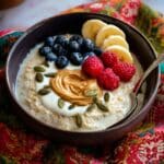 - Serve and top: Divide the porridge into bowls. Top each portion with Greek yogurt, seeds, nut butter, and fresh or frozen fruit. Drizzle honey or syrup on top if desired for added sweetness.