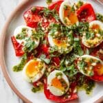 A vibrant and flavorful dish featuring soft ‘jammy’ boiled eggs paired with sweet roasted red peppers, topped with a zesty almond and parsley dressing. Perfect for a light lunch or brunch, served with crusty bread for a satisfying meal.