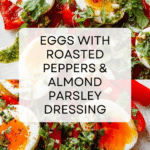 Keywords: jammy eggs, roasted peppers, almond dressing, parsley, brunch recipe, breakfast, Mediterranean, easy eggs