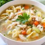 Store leftover soup in an airtight container in the refrigerator for up to 3 days. Reheat gently on the stove over medium heat, stirring occasionally. If the noodles absorb too much broth during storage, add a splash of chicken broth or water when reheating to restore the soup’s consistency.