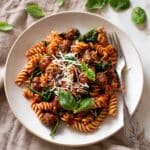 This sausage pasta is a hearty and flavorful weeknight meal that comes together quickly. With juicy Italian sausages cooked in a rich tomato sauce and tossed with tender spiral pasta, it’s comfort food made simple. Fresh basil and Parmesan add the perfect finishing touch.