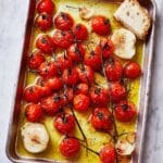Keywords: slow cooked tomatoes, baked garlic tomatoes, cherry tomatoes recipe, olive oil tomato sauce, easy vegetarian side dish