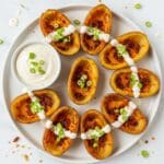 - Finish and Garnish: Top the melted potato skins with diced bacon, sliced green onions, and a drizzle of homemade ranch dressing. Serve warm and enjoy!