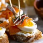 - Step 4: Spread each slice of baguette with mayonnaise or aioli. Top with a swirl of smoked salmon, half a quail’s egg, and two anchovy slivers.