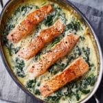 - Step 5: Arrange the salmon fillets on top of the spinach in the dish.