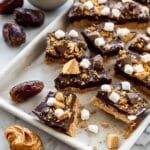 Keywords: s’mores date bark, no bake snack, healthy sweets, peanut butter chocolate bark, medjool dates, easy dessert