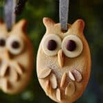 - Add almond features and make hanging holes: Press whole blanched almonds into the dough to form the owls’ eyebrows and beaks. If you plan to hang the biscuits as tree decorations, use the end of a paintbrush to make a small hole near the top of each biscuit for threading string or ribbon later.