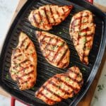 - Grill the chicken: Place the marinated chicken breasts on the grill. Cook for 4-6 minutes per side depending on the thickness, ensuring the internal temperature reaches 165˚F for safe consumption.