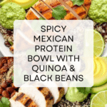 Keywords: Mexican protein bowl, chicken bowl, quinoa bowl, salsa verde, black beans, healthy Mexican recipe, spicy chicken bowl