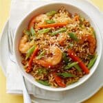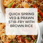 Keywords: spring vegetable stir-fry, prawn stir-fry, brown rice recipe, healthy stir-fry, quick dinner, hoisin sauce, sesame seeds, ginger stir-fry