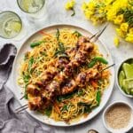 - Serve: Arrange the grilled chicken skewers over a platter of the prepared noodle salad. Serve with extra lime wedges for squeezing over to add a fresh, zesty finish.