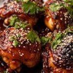 This Sticky Honey Soy Chicken recipe features tender, juicy chicken thighs or drumsticks baked to perfection in a luscious glaze of honey, soy sauce, garlic, and spices. The result is a sweet and savory dish with a sticky, caramelized coating, garnished with sesame seeds and fresh coriander, perfect for serving alongside rice and steamed greens.