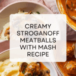 Delicious Stroganoff Meatballs & Mash featuring tender beef meatballs baked to perfection, smothered in a creamy mushroom and paprika sauce, served alongside comforting mashed potatoes and wilted spinach. A hearty and gluten-free meal perfect for a cozy dinner.