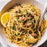 This canned tuna pasta is a quick, flavorful, and satisfying meal featuring spaghetti tossed with aromatic garlic, anchovies, capers, and chili flakes, all combined with tender tuna and brightened with lemon zest and juice. Perfect for a tasty weeknight dinner, it uses pantry staples and cooks in under 20 minutes.
