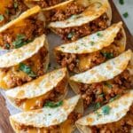 Tiny Tacos are perfect for a fun appetizer or a casual snack. These bite-sized treats combine flavorful taco meat, melted cheese, and creamy refried beans on crispy tortilla chips.