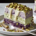 Delight in these vibrant Ube Pistachio Ice Cream Bars, combining the creamy sweetness of purple yam with rich pistachio flavors. Made with coconut milk, whole milk, and a touch of honey, these homemade frozen treats offer a unique twist on classic ice cream bars. Perfect for a refreshing dessert, these bars feature a luscious ube layer topped with a smooth pistachio layer and garnished with chopped pistachios and a drizzle of sweetened condensed milk.
