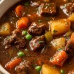This hearty Vegetable Beef Soup features tender, fall-apart stewing beef simmered with fresh vegetables and flavorful herbs in a rich broth enhanced by red wine or stout. Perfect for a cozy fall meal, this soup combines browned beef, aromatic garlic and onions, carrots, celery, potatoes, peas, and buttery mushrooms, resulting in a comforting and satisfying dish served best with crusty bread.